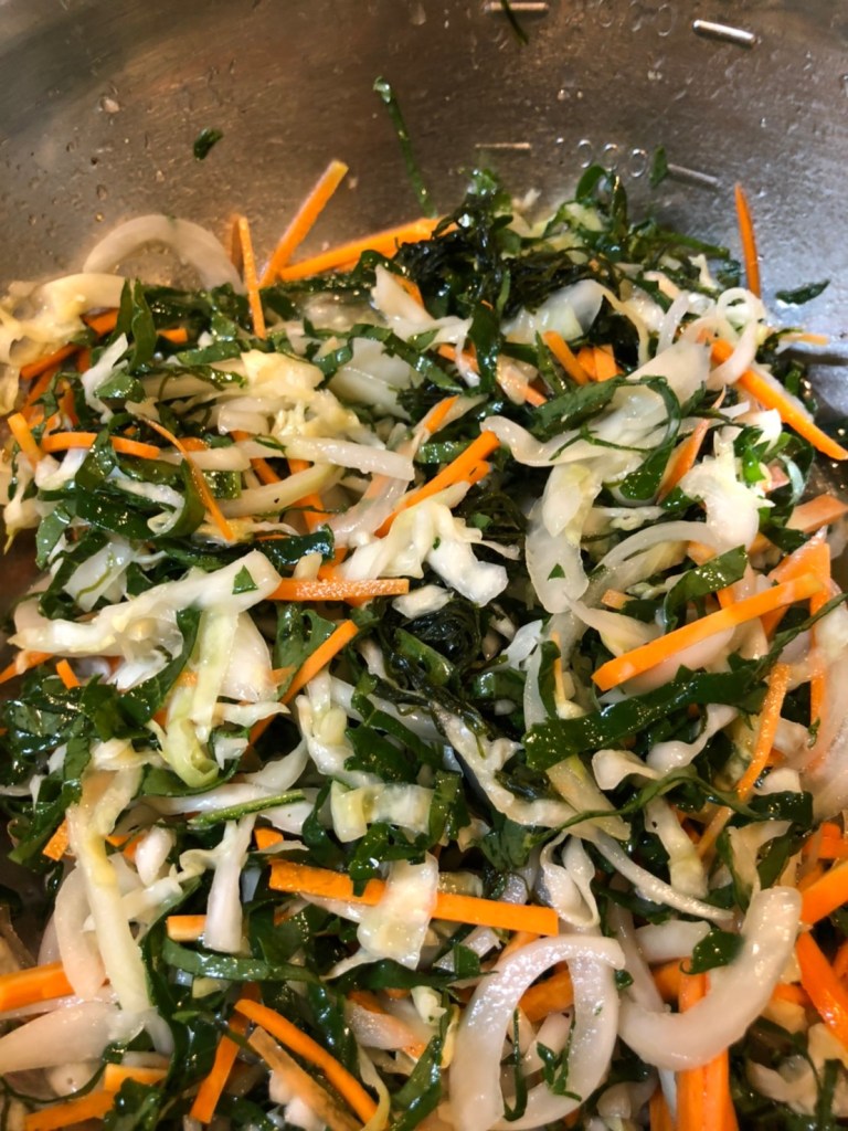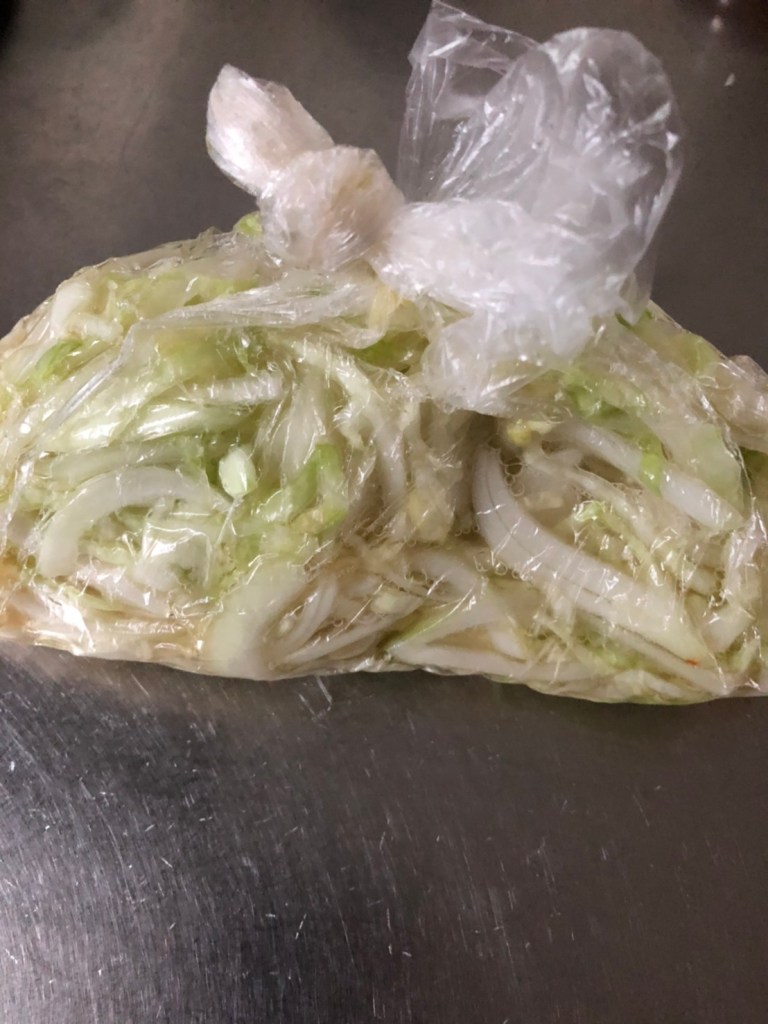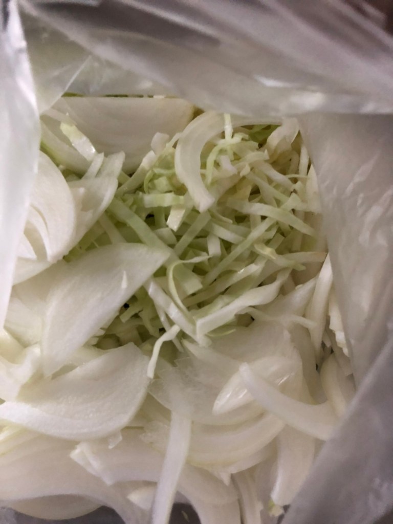 作り方は簡単。千切りにしたキャベツをジップロック等に入れ、塩でもみ、酢をひたひたに注いで半日ほど置くだけ。でもそれでは食べづらいし、横着な私は酢たまねぎと一緒に作り、サラダにしてしまいます。そうすることで、酢たまねぎと一緒に摂れ、面倒もありません。一度作れば、3日は食べられます。