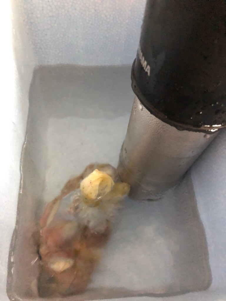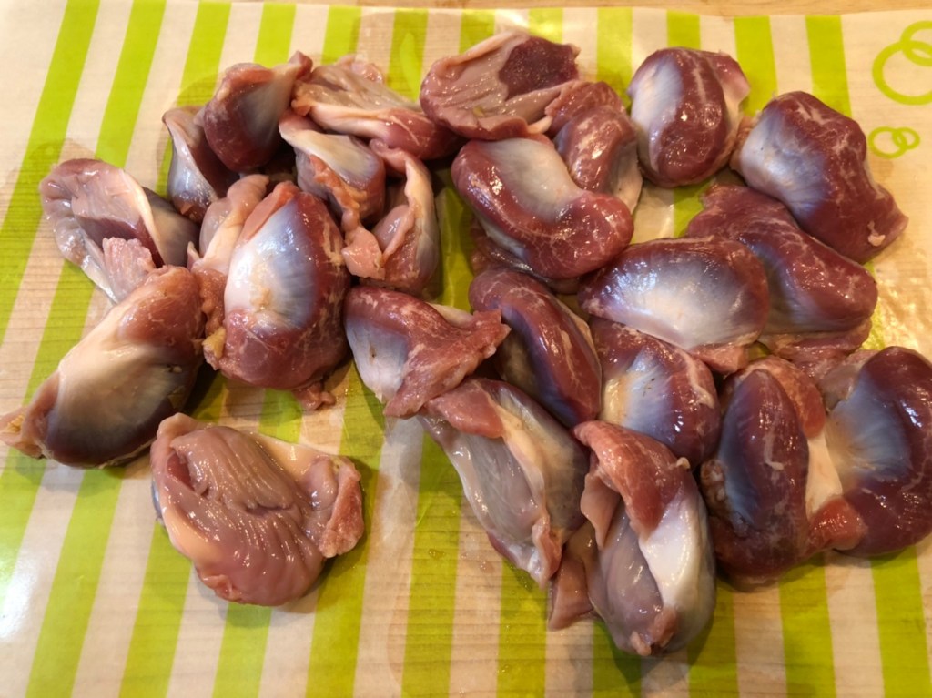 ① 砂肝は白い皮の真ん中を包丁で切り、二つにします。