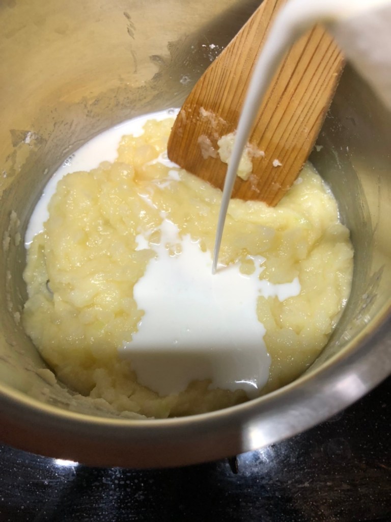 ④ ③の鍋に少しずつ牛乳を加え、都度、泡立て器でよく混ぜる。全部混ざったら木べらに替え、弱火で底をこそげとるように混ぜ続ける。