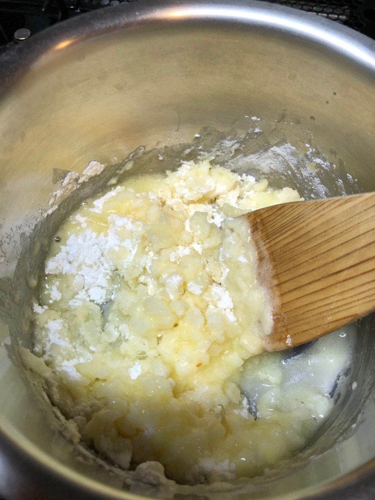 ③ ②の鍋に米粉を入れ、よく混ぜる。粉っぽさがなくなってきたら、火をつけ、1分ほど軽く炒める。