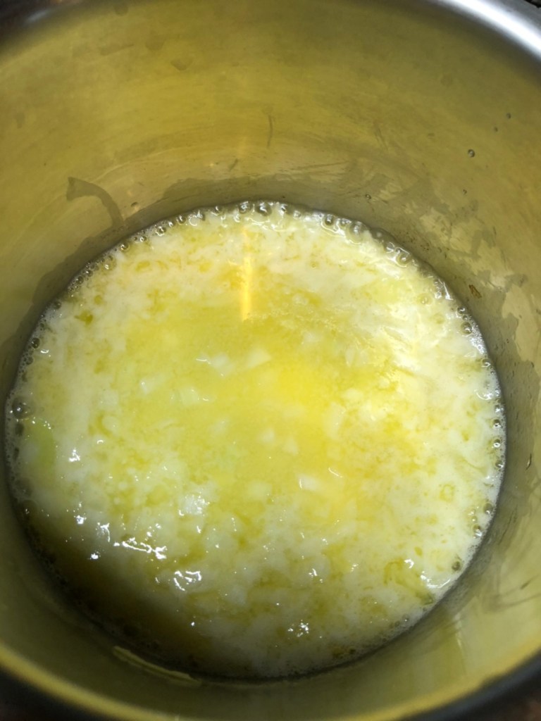 ② 鍋にバターを溶かし、玉ねぎを炒める。透き通ってきたら、一旦火を止める。