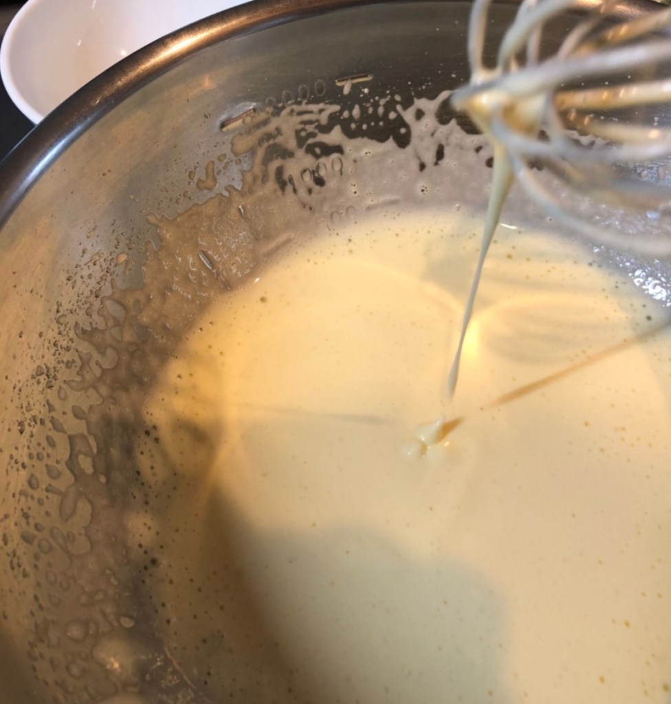 ④ 卵に砂糖を加え、白っぽいクリーム状になるまでよく泡立てる。