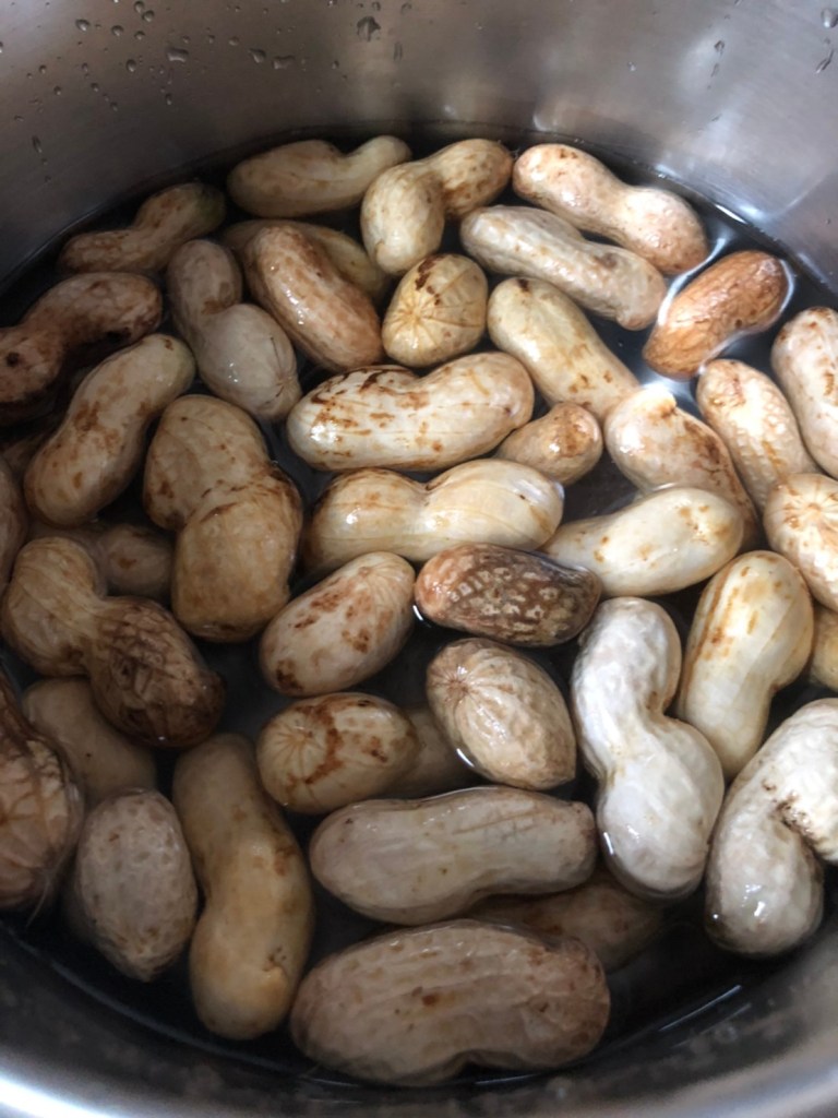 ① 生落花生をよく洗い、圧力鍋に入れる。水はひたひたより多めに。塩大1ほど加えひと混ぜする。