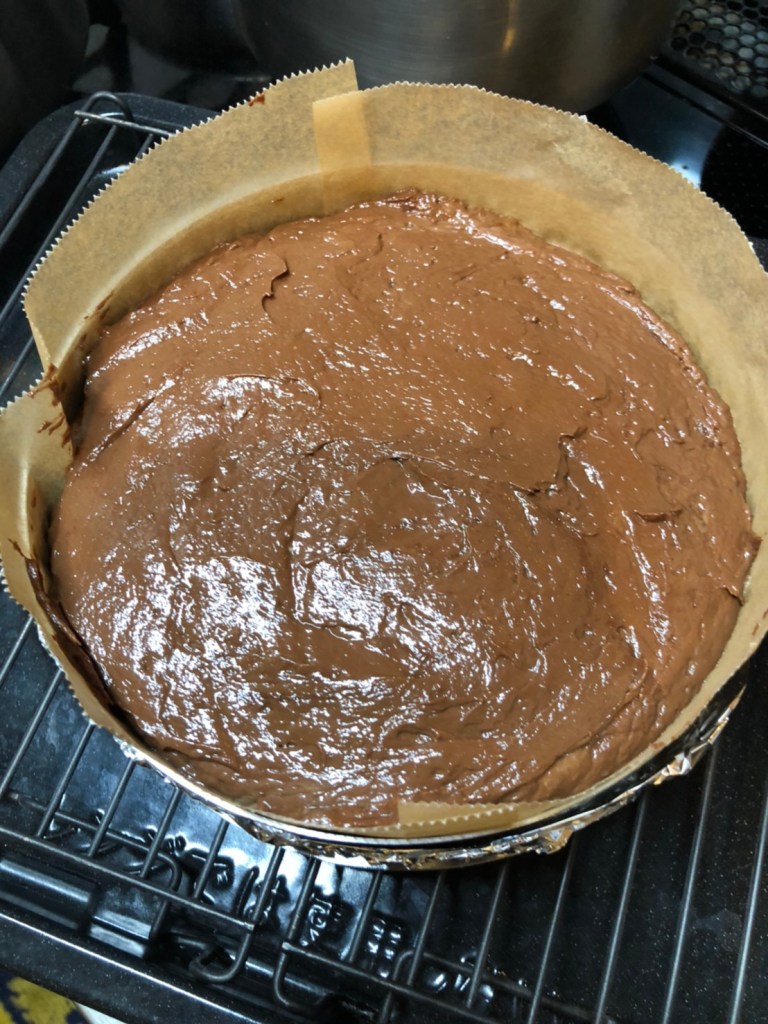 *セルクルの底をアルミホイルで覆い、内側に型に合わせて切ったオーブンシートを敷く。チョコレートのビスキュイをを底に敷いておく。型の下には18㎝以上の敷板を敷く。