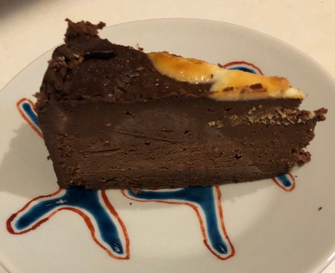 ニューヨークチーズケーキですが、チョコレートがたくさん入っている、濃厚な食感です。ハロウィン仕様で焼いているので、見た目はアレですが。