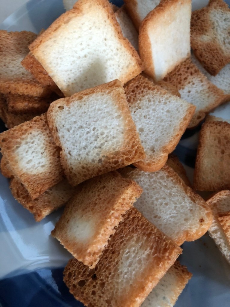 市販のクラッカーでグルテンフリーはなかなか見つかりません。たまにあってもライ麦などで作られ風味が小麦のクラッカーとは異なったり、豆ベースだとカチカチでペースト類を乗せて食べるにはイマイチだったりします。困ったなぁ、と思っていたのですが、トースト専用の米粉パンを成城石井で見つけ、これを活用することで、クラッカーの代替になります。まるでラスクですが、レバーペーストやバター等を付けても問題なく、もしかしたら普通のクラッカーより美味しいかもしれません。