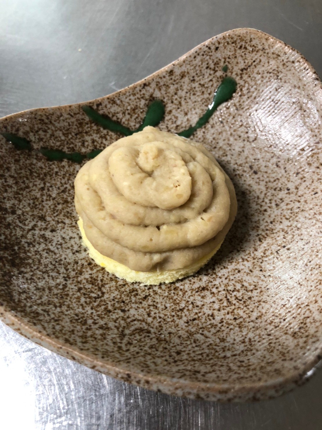 ちょっと見た目はアレですが、水切りヨーグルトも使った栗のデザートです。モンブラン風になっています。もっと細い口金でも生地は出てきますので、アレンジしてみてください。トップに栗の甘露煮などを置いたらもっとそれらしく見えると思います。