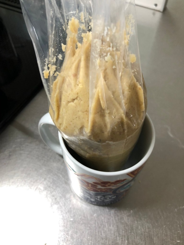 *栗の生地が余ってしまったら、タッパーなどに中身を出し、形を整え、冷蔵庫で冷やし固めると、しっとりしたマロンケーキになります。いつも絞り出すのが大変で何個か作って残りはマロンケーキになってしまっています。