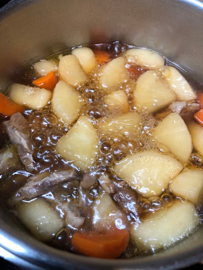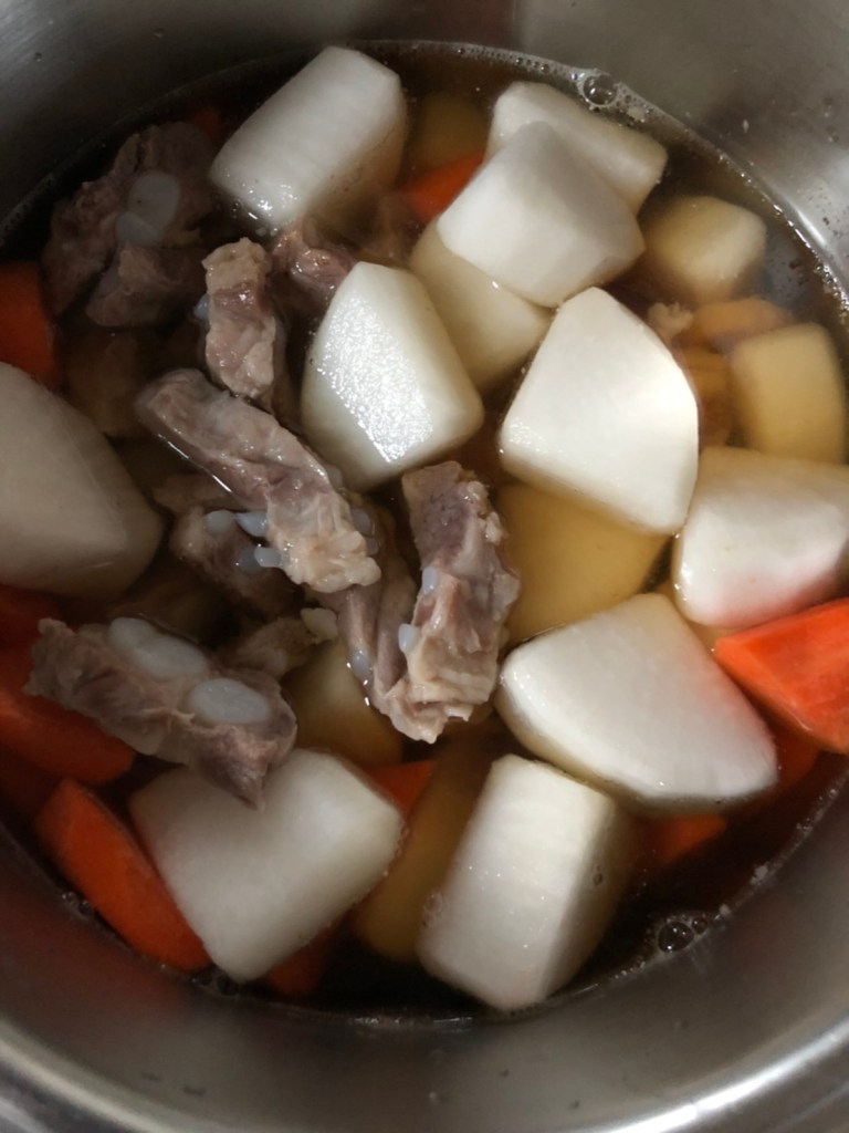 ② 圧力鍋に豚軟骨を戻し、いちょう切りの大根(余裕があれば面取りする)と人参、酒、醤油、みりん、砂糖、薄切りにした生姜を加え、最後に出汁をひたひたになるまで加える。蓋をし、火にかけ、圧がかかったら25分。