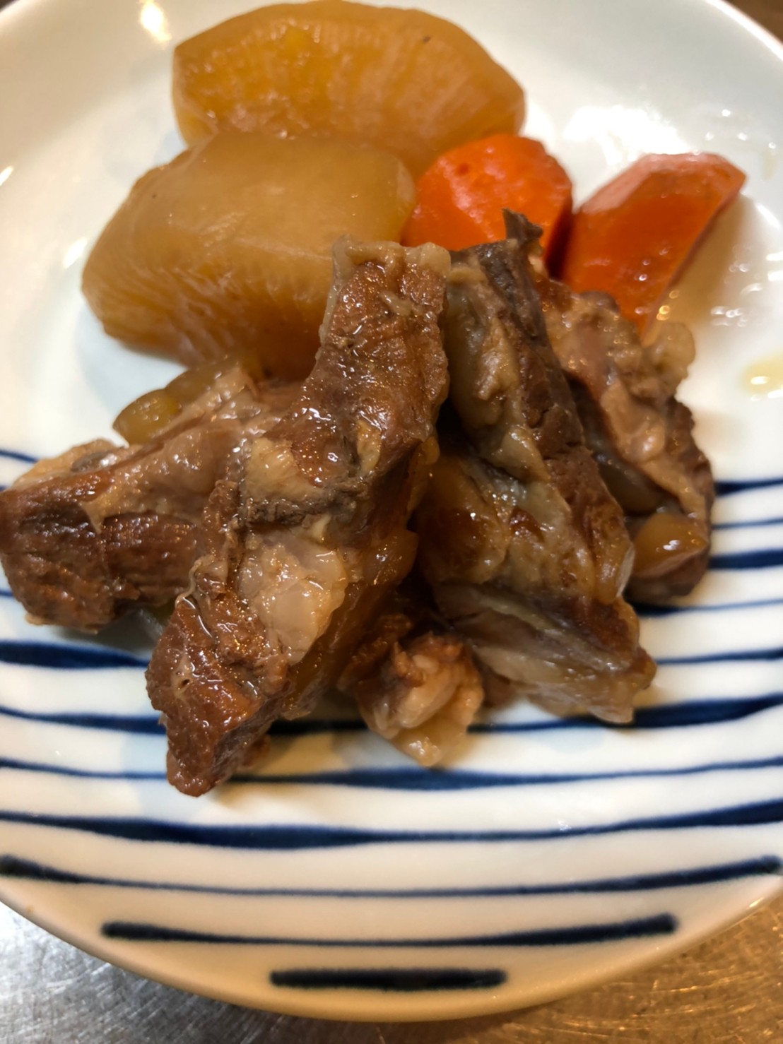 豚バラ肉の軟骨が付いている部分の煮物になります。常にスーパーに置いてあるものではないので、見つけたら買って作ります。圧力鍋を作るので、短時間で軟骨が柔らかく美味しく食べられるようになります。軟骨にはカルシウムや関節によいとされるコンドロイチンが豊富に含まれています。また、コラーゲンも豊富で美容にもよさそうですね。軟骨と一緒に大根や人参を煮れば、食欲不振や美肌、風邪のひき始めにも効果的な一品になります。
