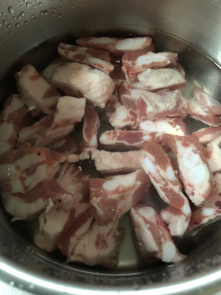 ① 圧力鍋に豚軟骨とひたひたの水を入れ、蓋をし、火にかけ、圧がかかったら10分。ロックが解除されたら水を捨て、鍋を綺麗に洗う。