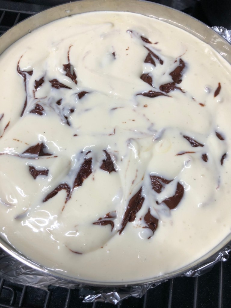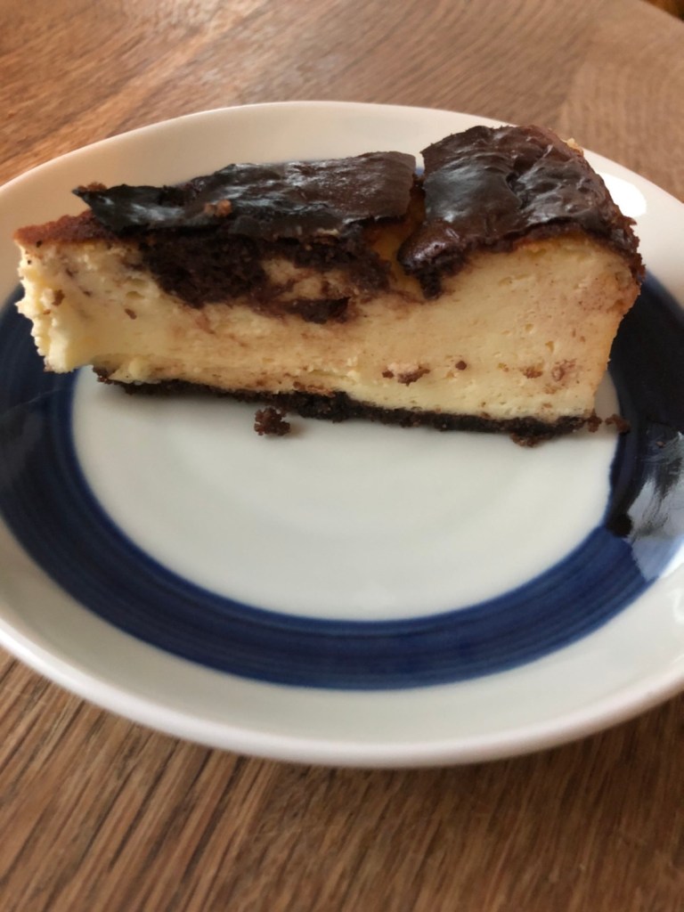 ホエイを摂取した後に残る水切りヨーグルトを活用して作ったスイーツです。今回はニューヨークチーズケーキ風。チョコレートを少し、マーブル状に入れ込みました。実はオーブンで天面を焦がしてしまって、マーブルが真っ黒になって見えません。うちのオーブンは2段あり、下段で焼かなくてはならないところ、上段に置いてしまいました。中身は美味しくできたので、そのまま食べていますが…オーブンの中の置き場所にはくれぐれもご注意ください。