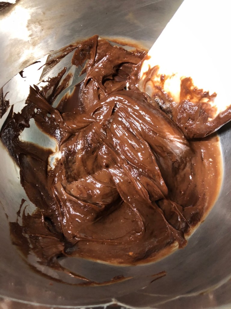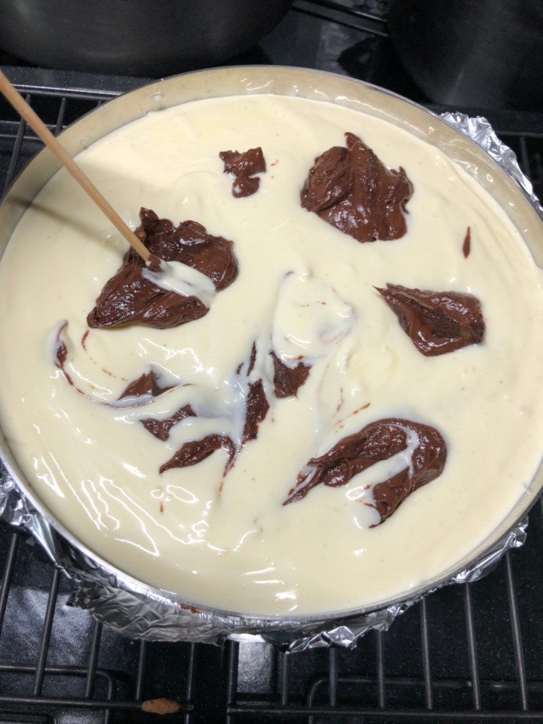 ⑤ チョコレートマーブルにする場合には湯せんで溶かしたチョコレートに生地60gを合わせよく混ぜ、チョコレート生地を作る。