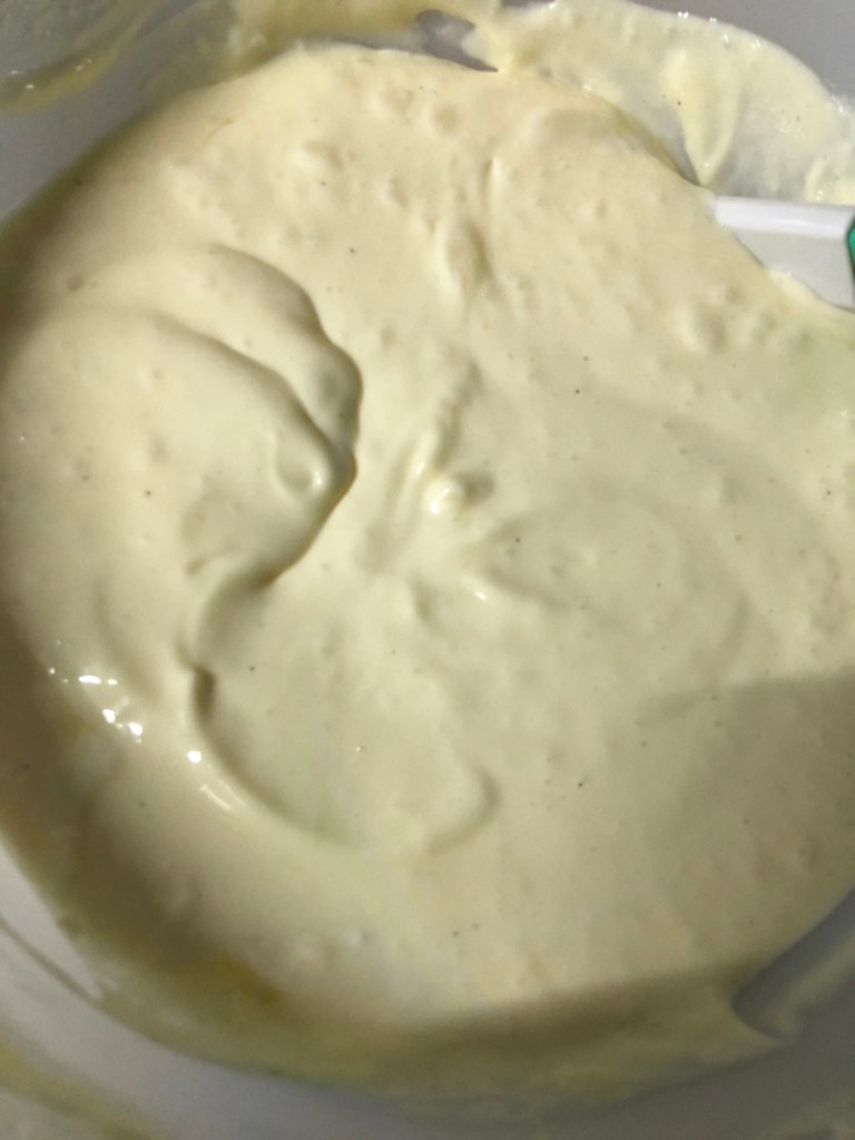 ④ 水切りヨーグルトを加え、よく混ぜ合わせる。さらに溶いた卵とバニラビーンズを加え、泡立たないように静かにムラなく混ぜる。