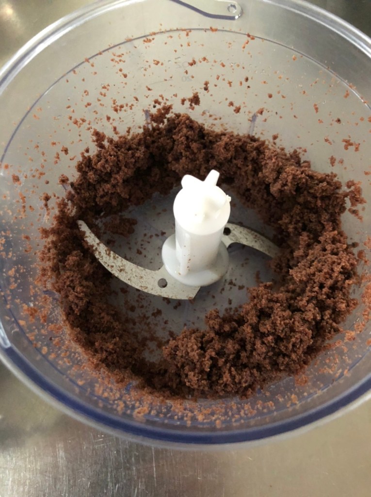 ② クッキーまたはチョコレートビスキュイをフードプロセッサーで細かくし、溶かしバターを加えさらに撹拌ししっとりさせる。型にあけ、マッシャー等で上から押してフラットな底地を作る。