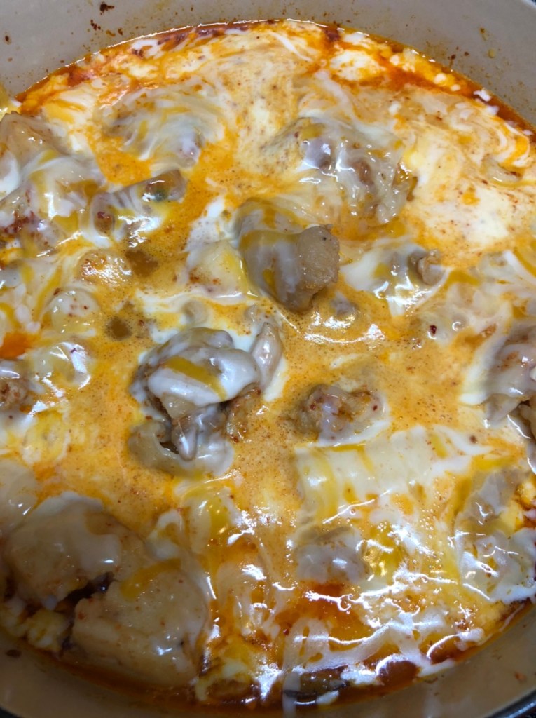 トッポギは韓国のお餅で日本のお餅と異なり、湯の中で溶けません。そのため、料理に便利で韓国ではスープの中に入れて食べられています。一般的なトッポギはコチュジャンベースのスープの中に日本のおでんのさつまあげ等の練り物が入っています。実際韓国では練り物を「おでん」と呼ぶそうです。出汁は煮干しがメインですが、大根も出汁としていい味を出してくれます。大根で出汁を取るという発想はありませんでした。韓国料理でならではなのでしょうか。最後にチーズを入れると風味が増して入れないよりずっと美味しくなります。溶けるチーズなら何でもよさそうです。塩分があった方がいいので、モッツアレラではない、安い普通のとろけるチーズで十分です。うちでは鶏肉も入れてしまうし、出汁用の大根も残して食べるので、これ一品でかなりボリューミーなメインディッシュになってしまいます。