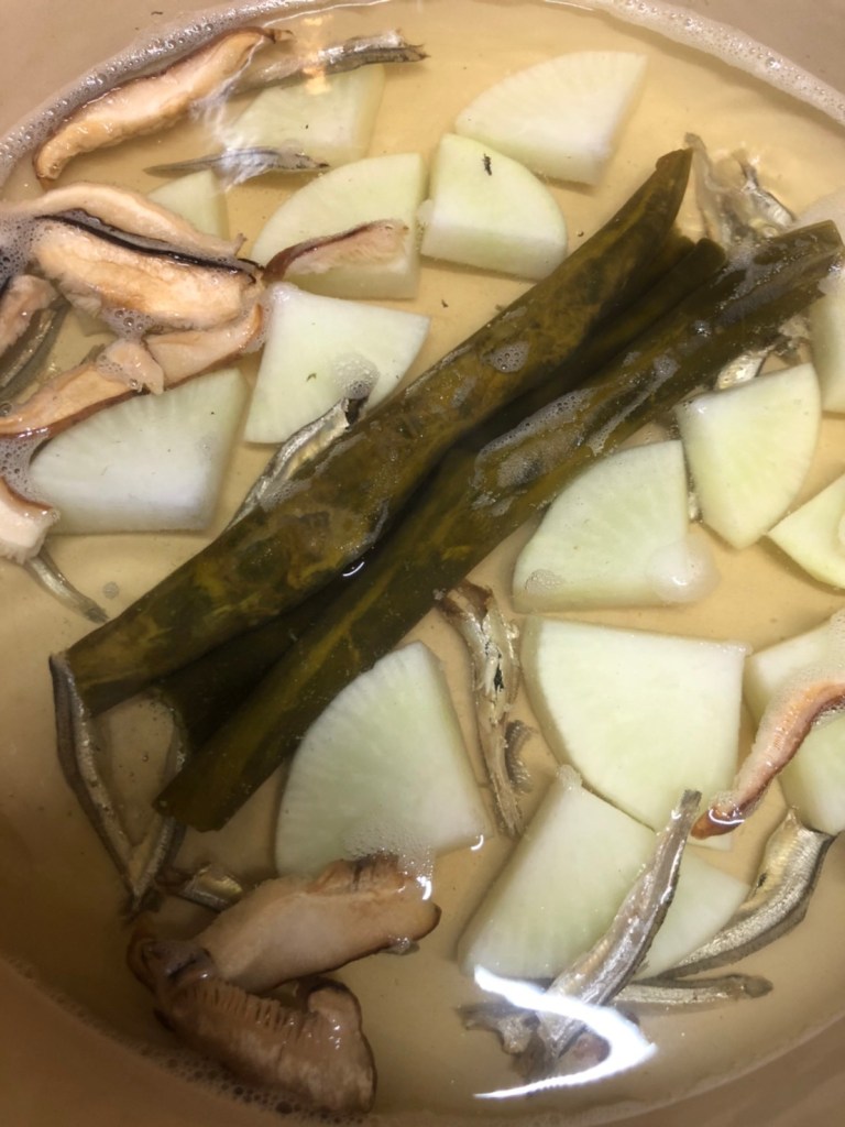 ① 鍋に出汁の材料を全て入れ、火にかける。沸騰したら蓋をして、時折灰汁を取りながら大根が軟らかくなるまで出汁を取る。