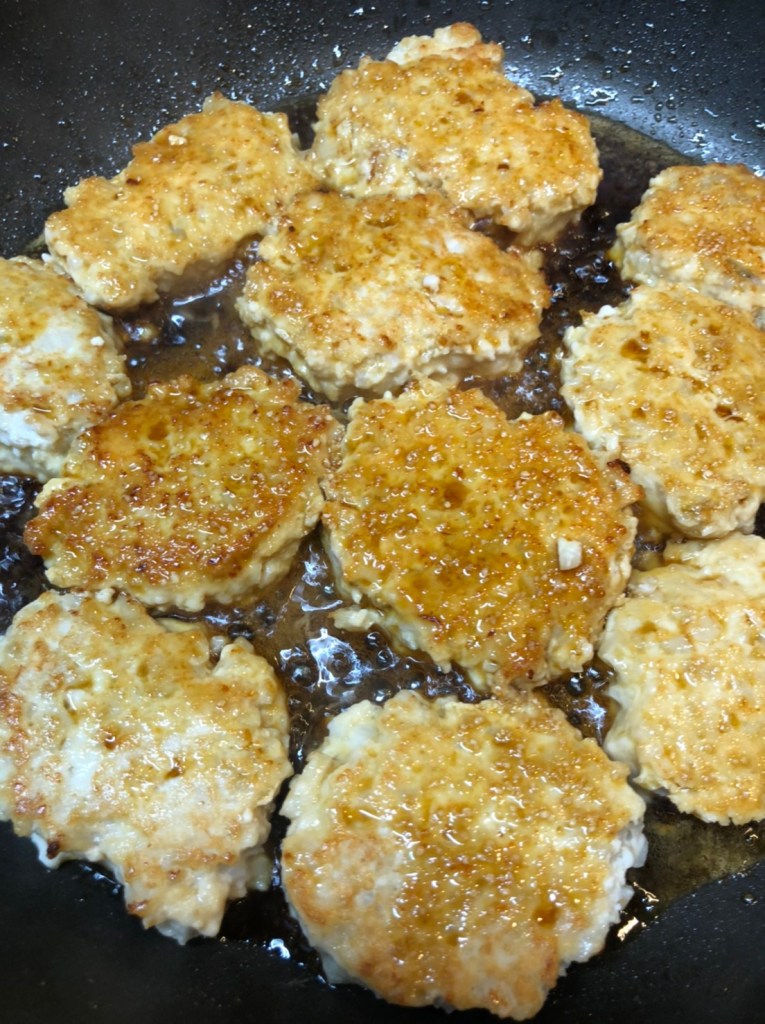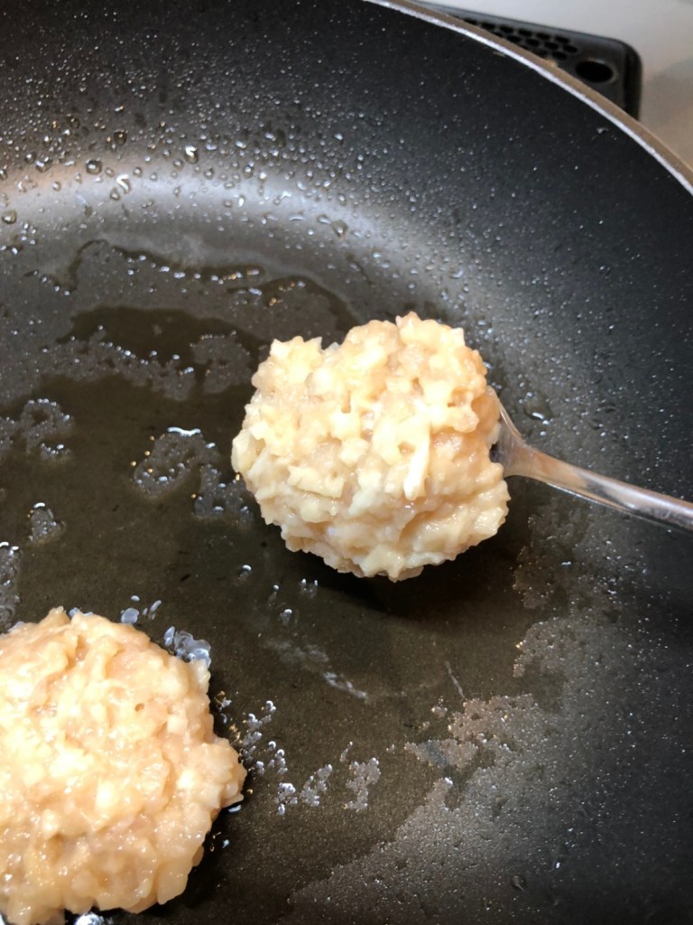 ② フライパンに油を多めにしき、スプーンで丸く①の生地を落とし、両面を色良く焼く。