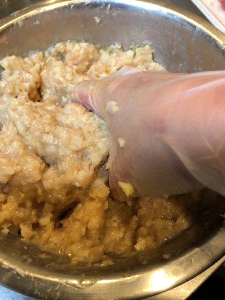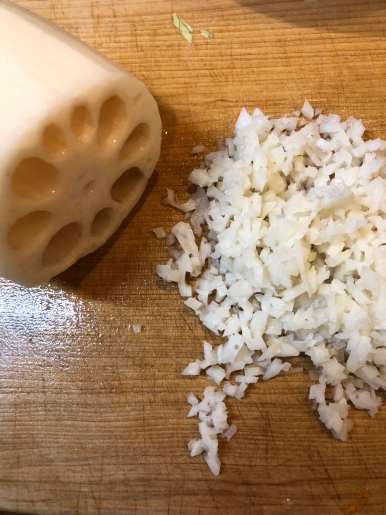 ① レンコンはみじん切り。ボウルで鶏ひき肉、レンコン、卵、醤油・酒・みりん・片栗粉をよく混ぜる。