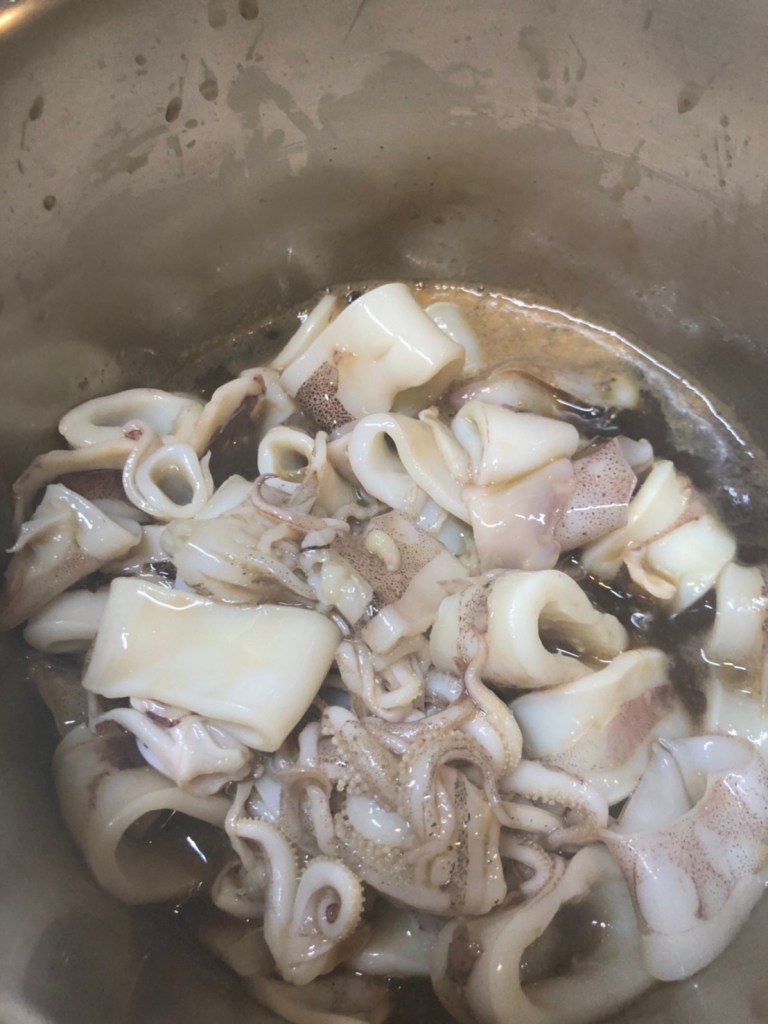 4. Put sauce back to the pan and boil again. Add squid and drain. Repeat 3 times.