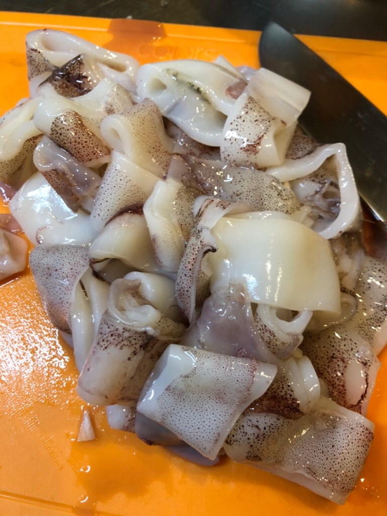 6. Put squid in a pan and mix with sauce. Stop heating. Don’t over cook. Do 3 and 4 quickly.