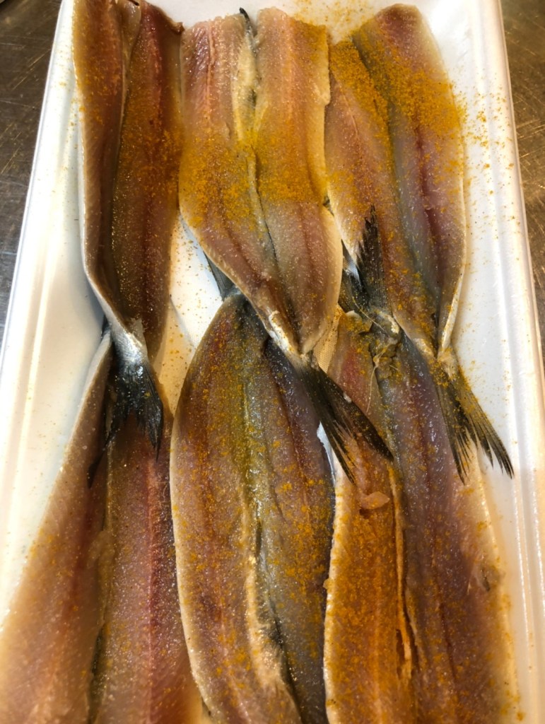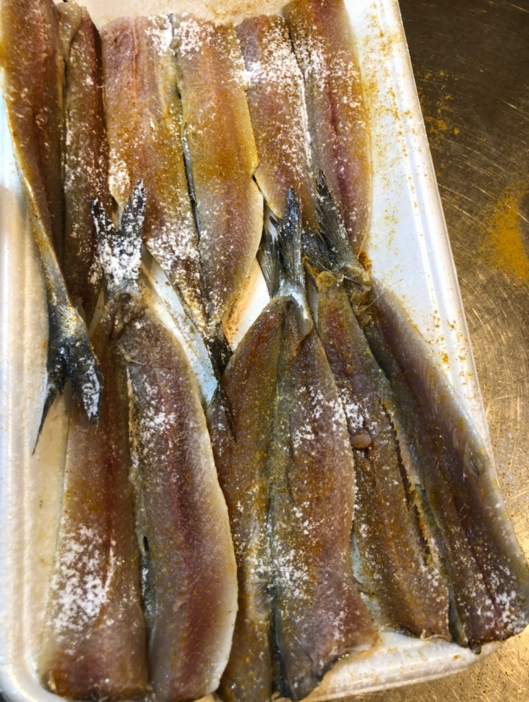 ② 薄く塩とカレー粉を両面にふる。その上に米粉を両面に茶こしを使って薄くふる。決してつけすぎない。