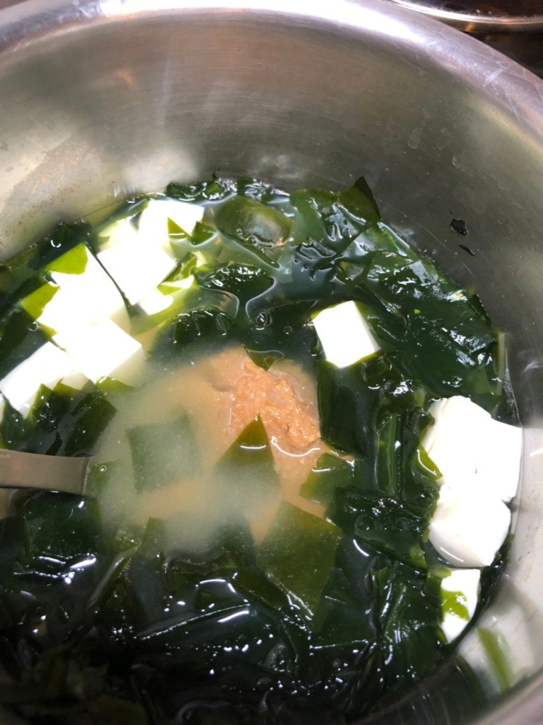 Miso soup with tofu and seaweed is the most basic miso soup. Therefore, dashi-soup is very important. It can be an easy dashi but never use just water. The taste would be very different. Also, there are many types of seaweed, and for this miso soup, it should be “wakame”. Wakame can be sold in dry or wet. In both cases, wakame should be soaked in a water before use.