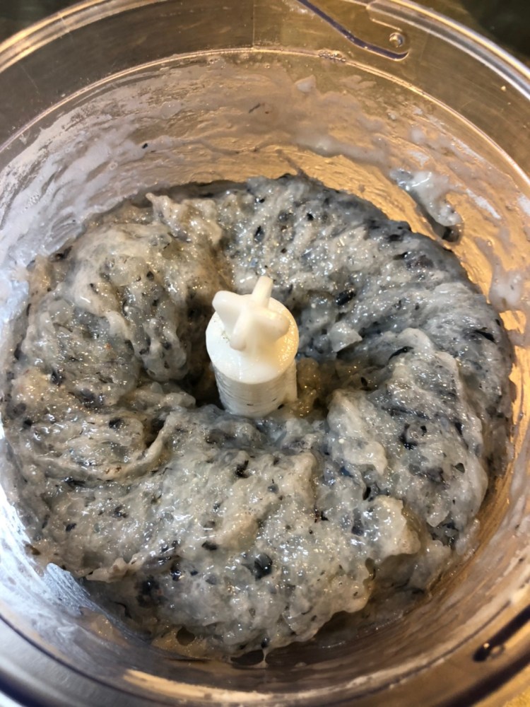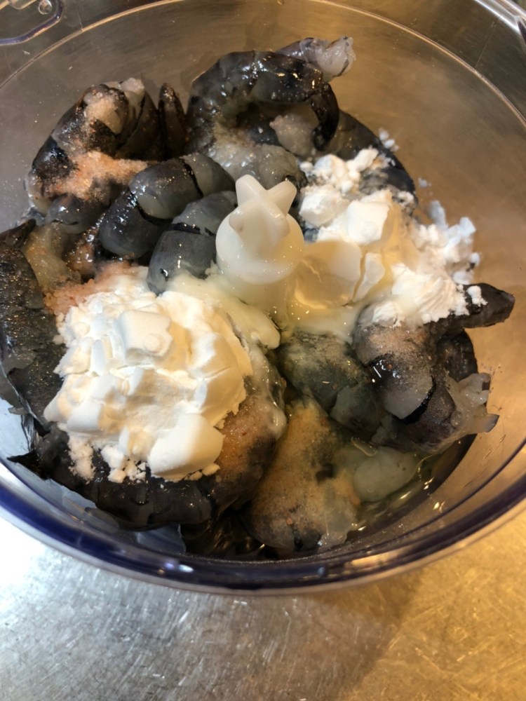① むき海老、塩、砂糖、片栗粉をフードプロセッサーに入れ、ペースト状にする。