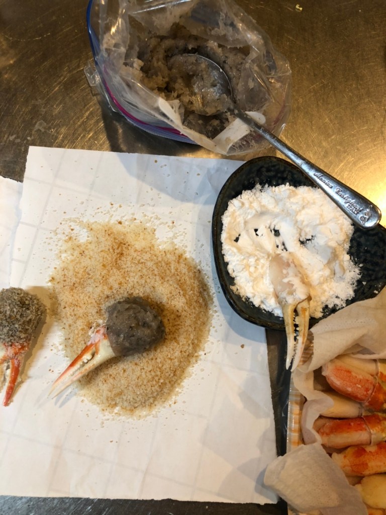 ③ カニの身の部分を覆うように海老のペーストを手で付け、パン粉を付けながら形を整える。