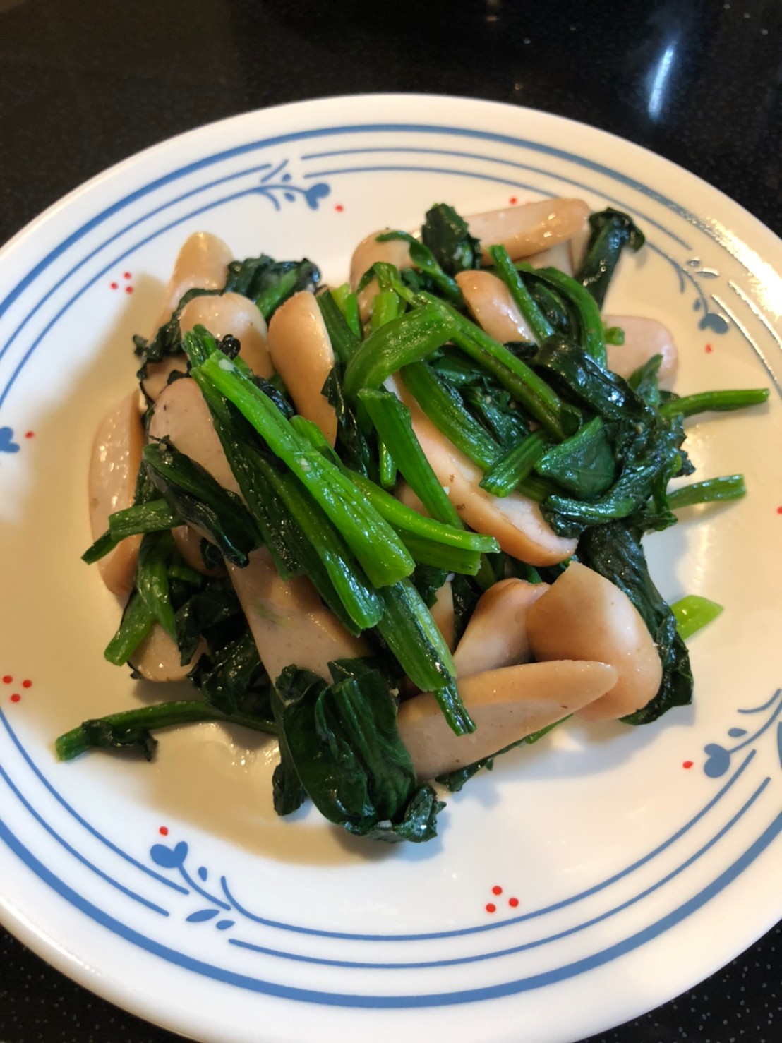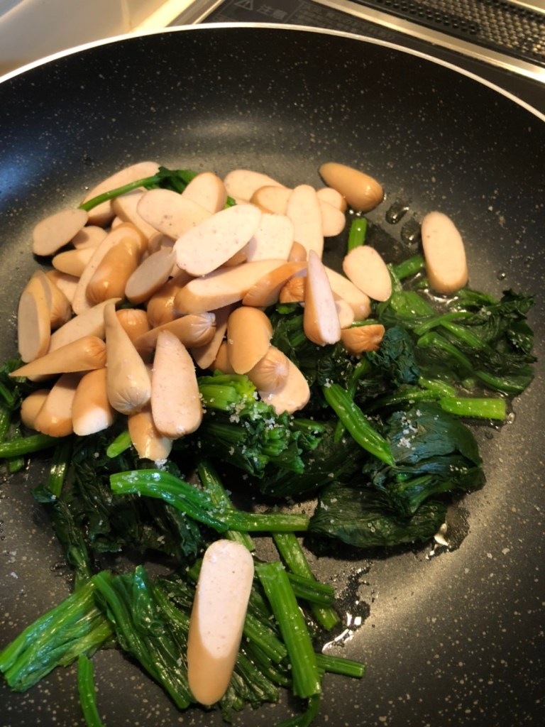 ほうれん草のソテーにウインナーを加えてみました。炒めるので、ほうれん草は固めに茹でます。ウインナー以外にも、コーンやベーコンも美味しくできます。