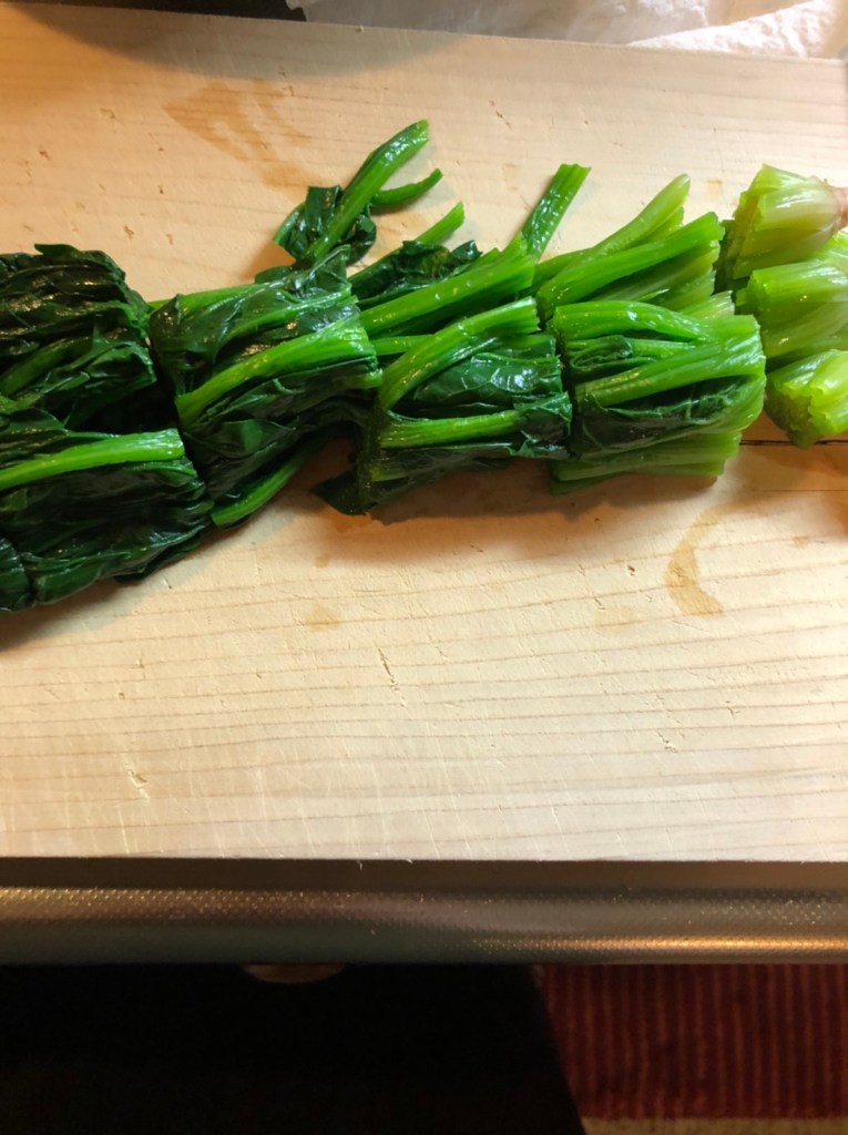 ③ ほうれん草を揃えて水を切る。ねじらないように気を付けて絞る。3㎝程度の長さに切る。