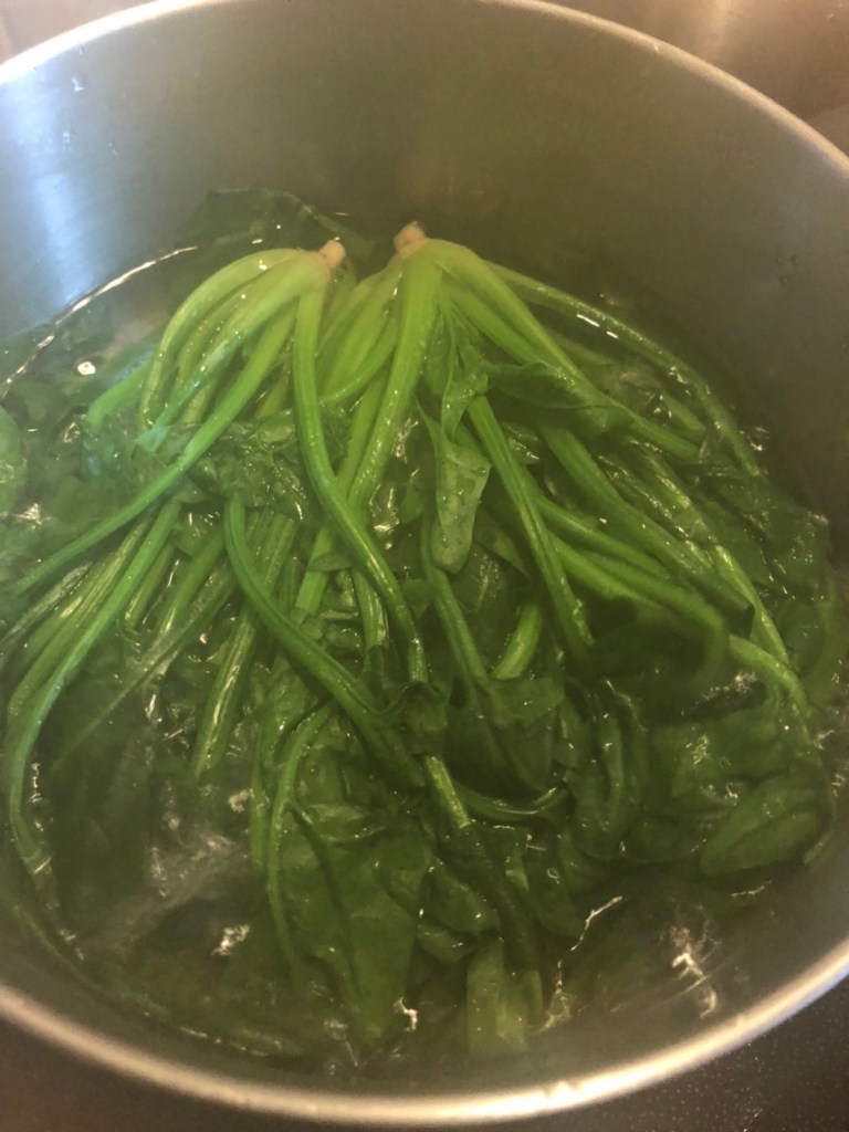 ① ほうれん草は洗ってから、塩小1程度を入れた湯で2分ぐらい茹でる。柔らかくなりすぎないように注意する。