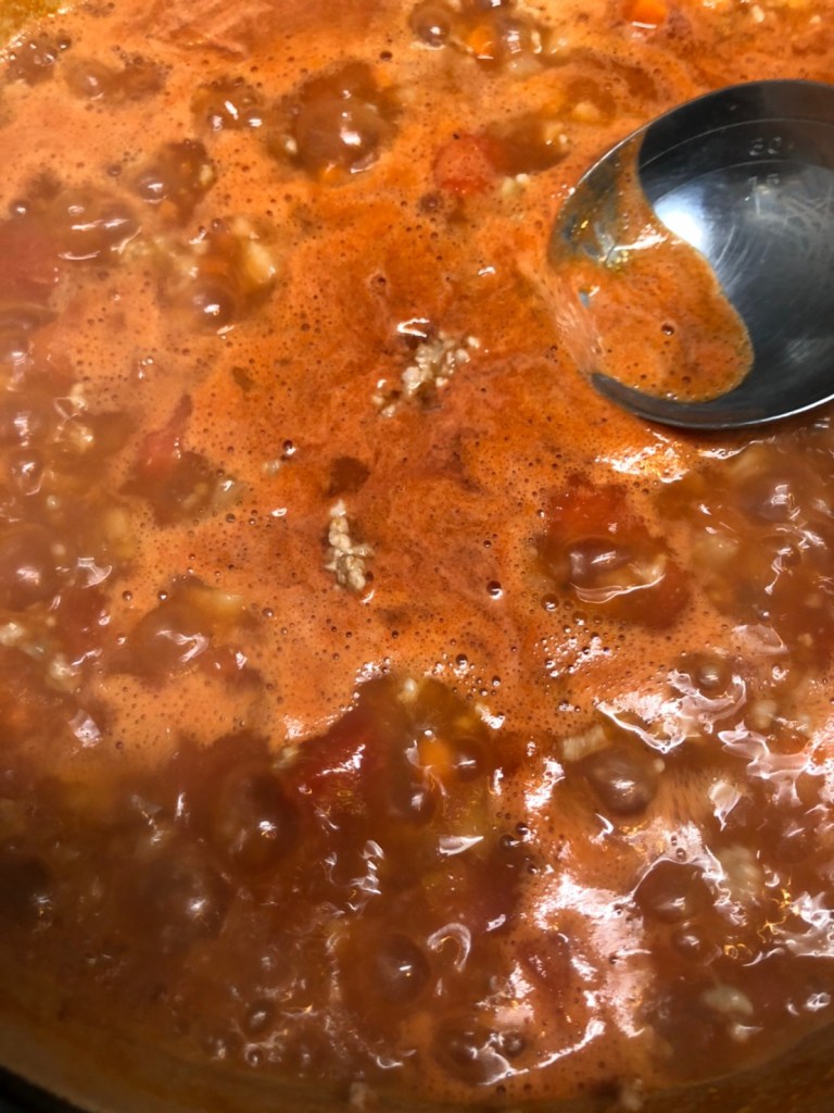 ③ 肉に火が通ってきたら、トマト缶、水、塩、胡椒、ローリエ、コンソメを加え、煮立たせる。