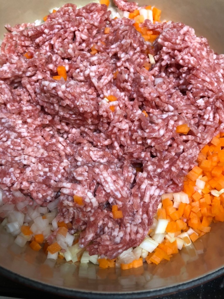 ② 鍋にみじん切りの野菜とひき肉を入れ、炒める。