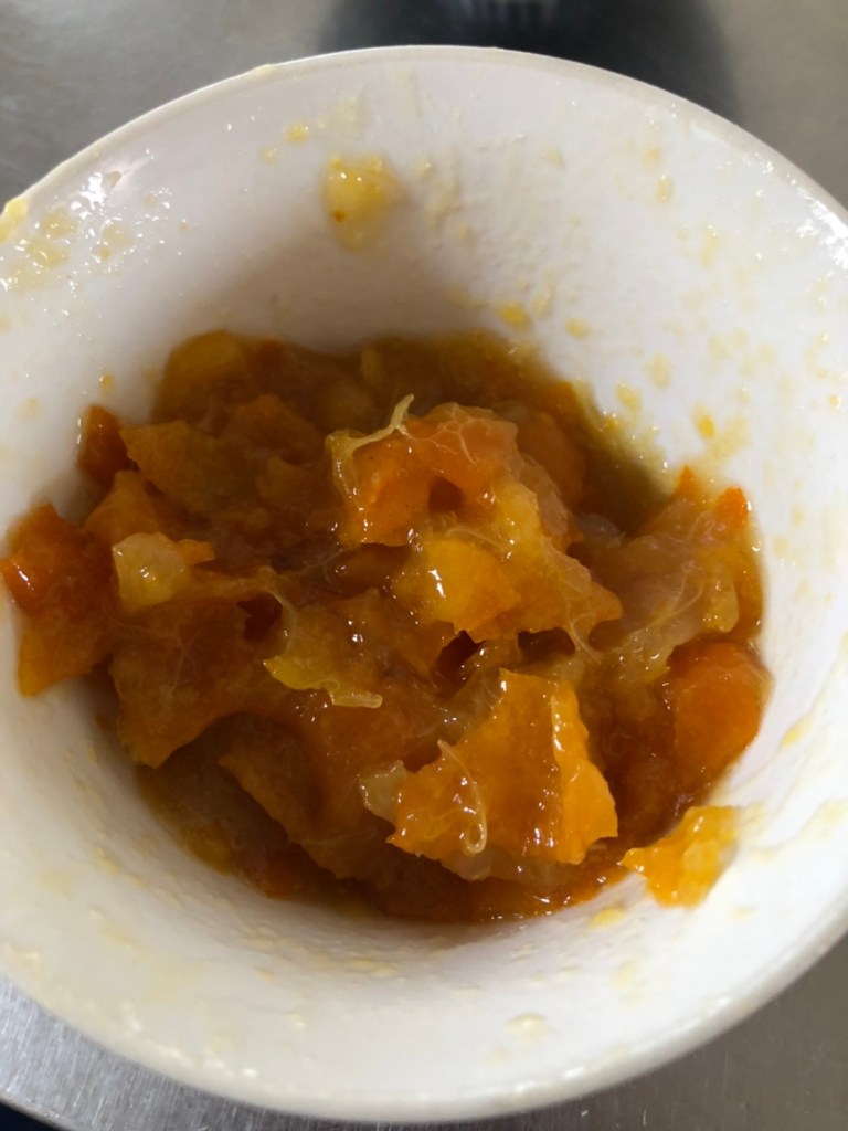 1. Soak gelatin in water. Remove seeds from kumquat in syrup and chop into small pieces.