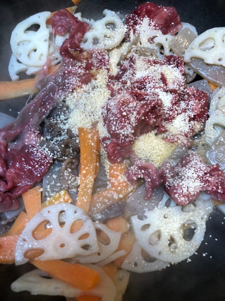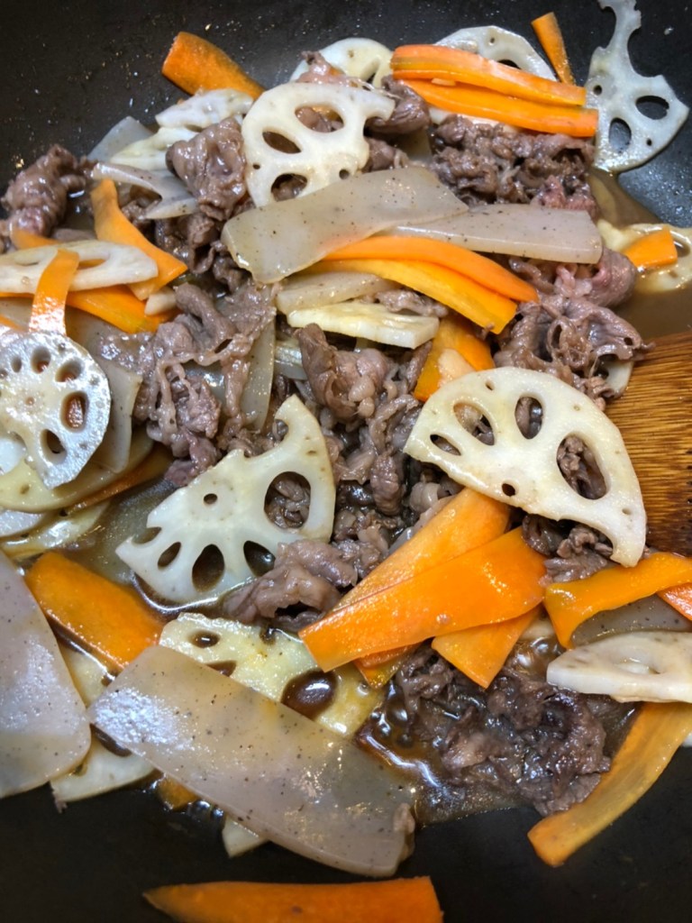 4. When the lotus roots become transparent, add beef, sugar, and mirin. Cook.