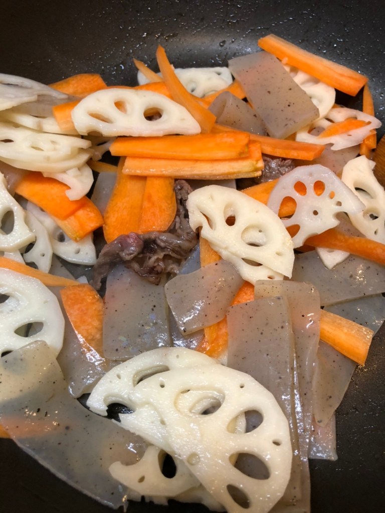 A dish of beef and lotus roots with a “kinpira” taste. Every “kinpira” is cooked with sugar, mirin, and soya-bean sauce. You can also add burdocks. Please slice vegetables and konjac at the same thickness.