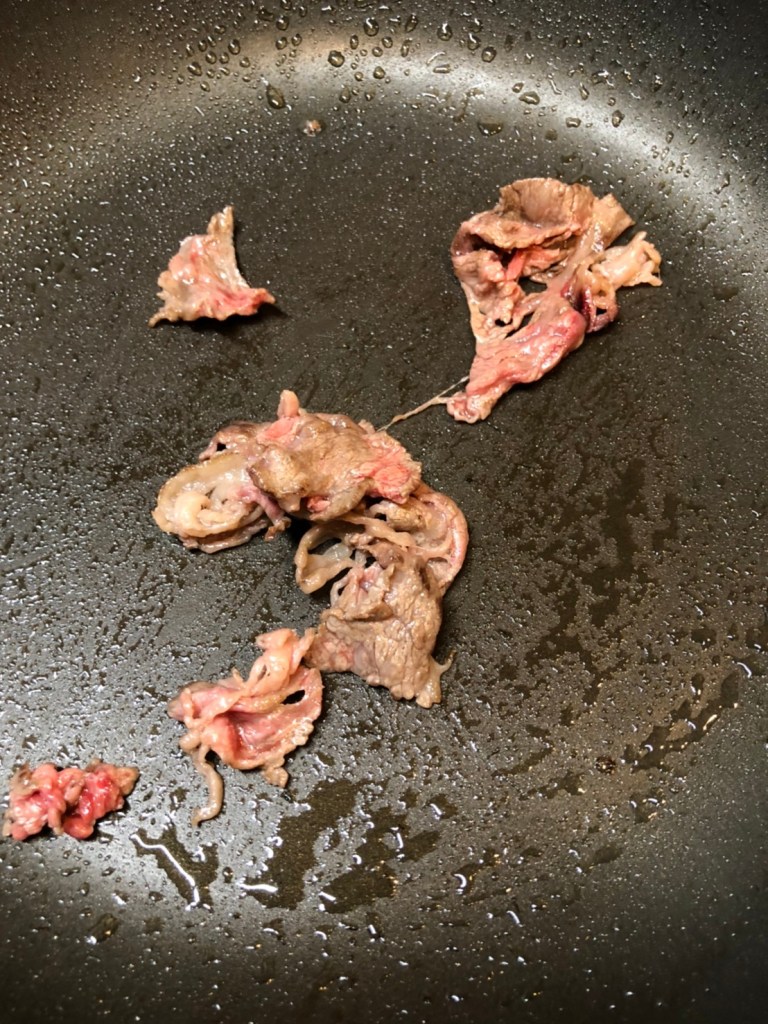 2. Spread oil and heat a pan. Cook 2 small pieces of beef.