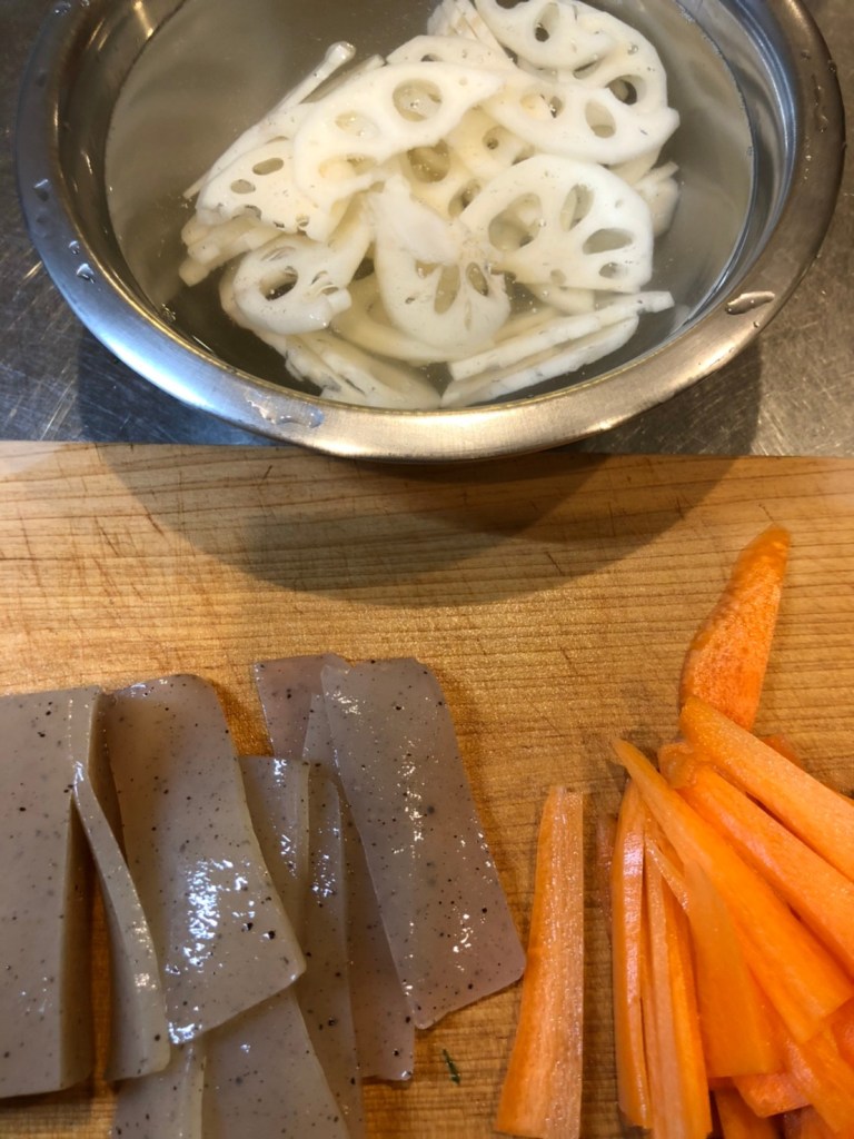 1. Peel skin of lotus roots. Cut into half and then slice with 2mm thickness. Soak in water. Cut carrot and konjac into 5cm x 2cm rectangles with 2mm thickness.