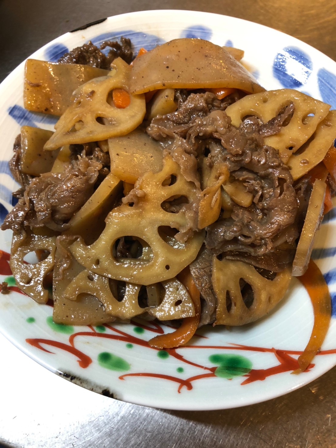 A dish of beef and lotus roots with a “kinpira” taste. Every “kinpira” is cooked with sugar, mirin, and soya-bean sauce. You can also add burdocks. Please slice vegetables and konjac at the same thickness.