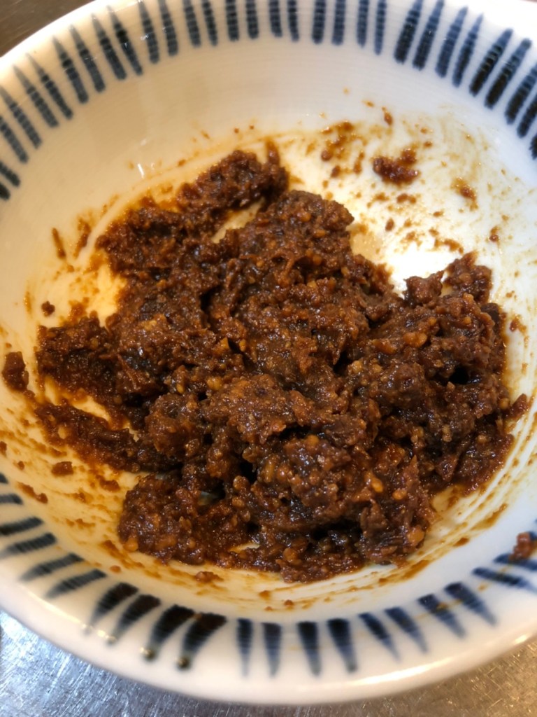 ① 出汁を用意しておく。生姜は薄切りにする。醤油、味噌、出汁10㏄を混ぜておく(味噌だれ)。