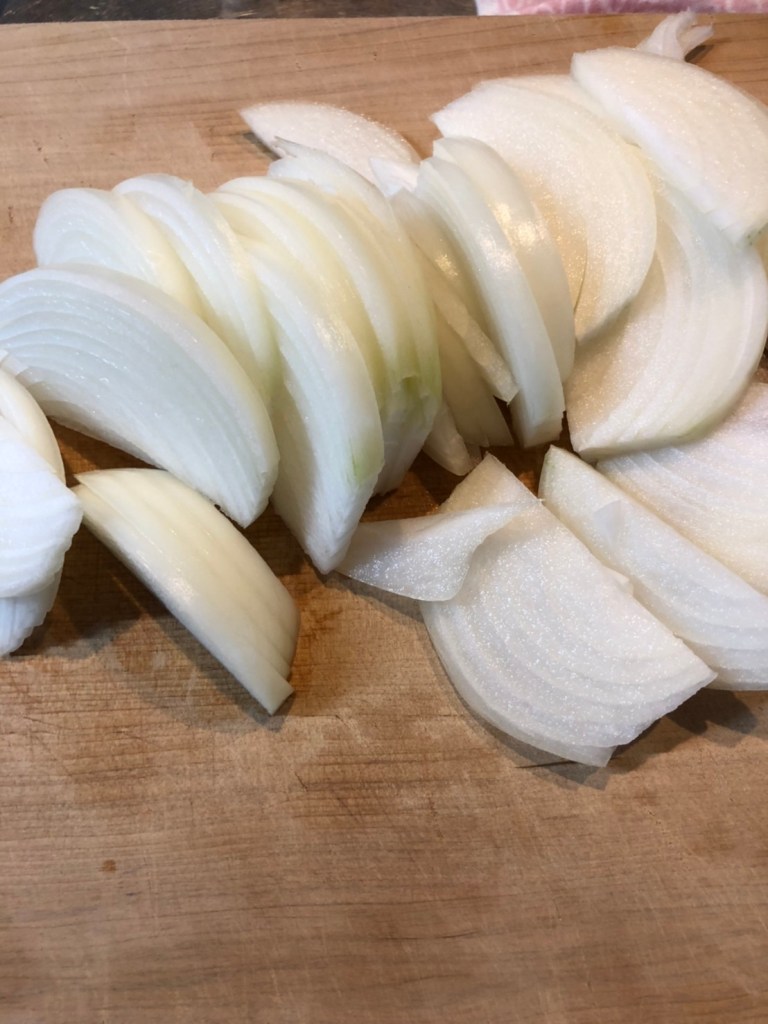 ② 玉ねぎを薄切りにする。