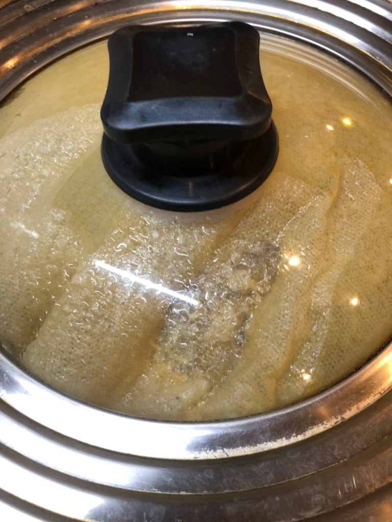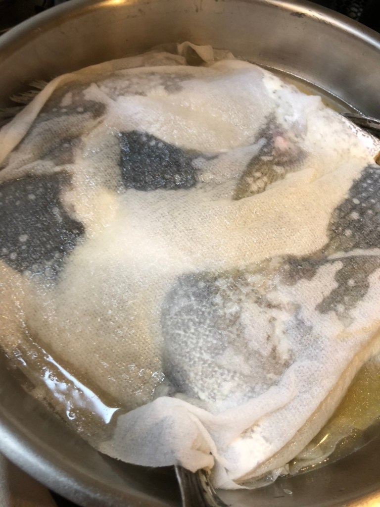 4. Place fish skin top. Pour boiling soup to the fish. Cover with kitchen paper like Bounty. Cook for 5 minutes at middle heat.