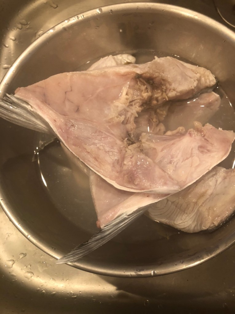 2. Pour 80C of hot water to the fish. Wash with cold water and remove all the remained scales. Wipe with kitchen paper.