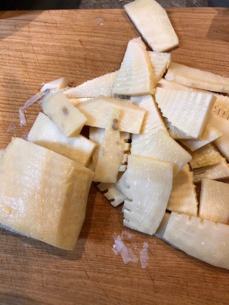③ ゆでたけのこは長さ5㎝で薄切りする。