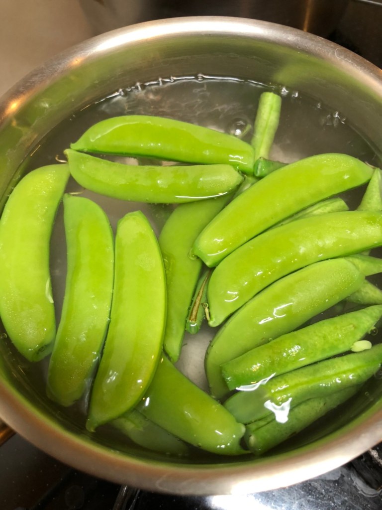 ① スナップえんどうはスジを取る。いんげん豆は両端を切り落とし、5㎝ぐらいの長さに切る。塩を加えた湯で30秒ほどスナップえんどうといんげん豆を茹で、ざるにあげておく。