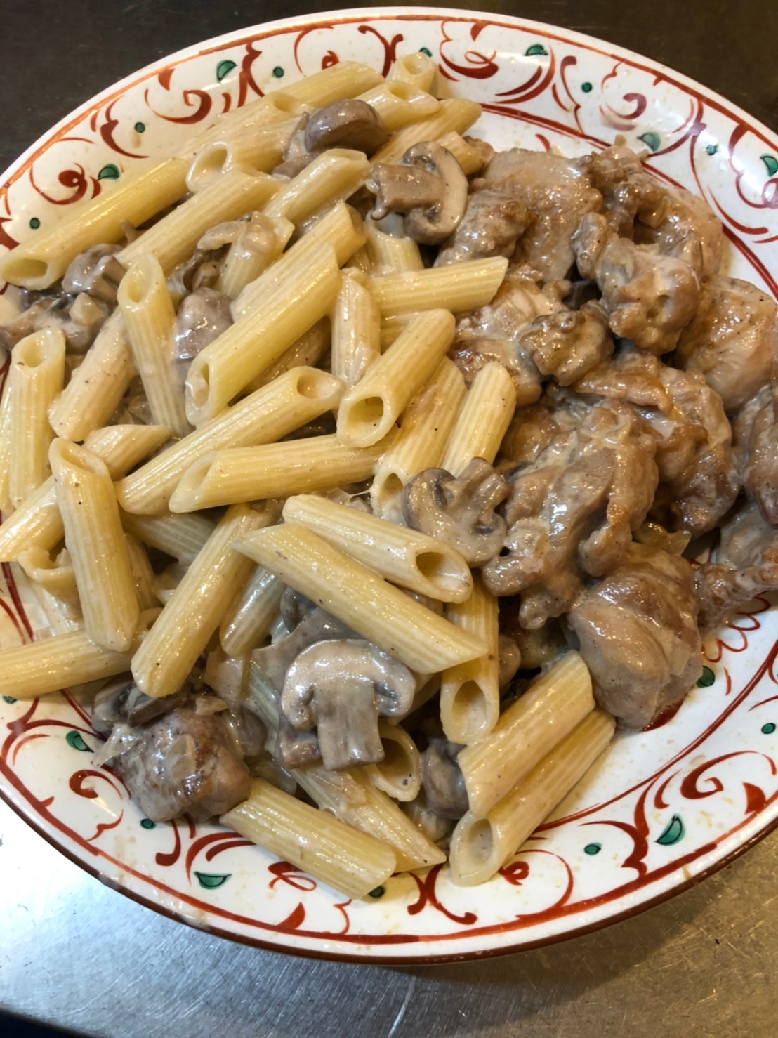マッシュルームをたくさん使ったクリーム煮です。マッシュルームの風味が美味しいソースですので、活用して一緒にペンネも絡めてしまいます。グルテンフリーにするためにはペンネ等はグルテンフリーのものを使います。メインと炭水化物を一緒に作ってしまう料理です。