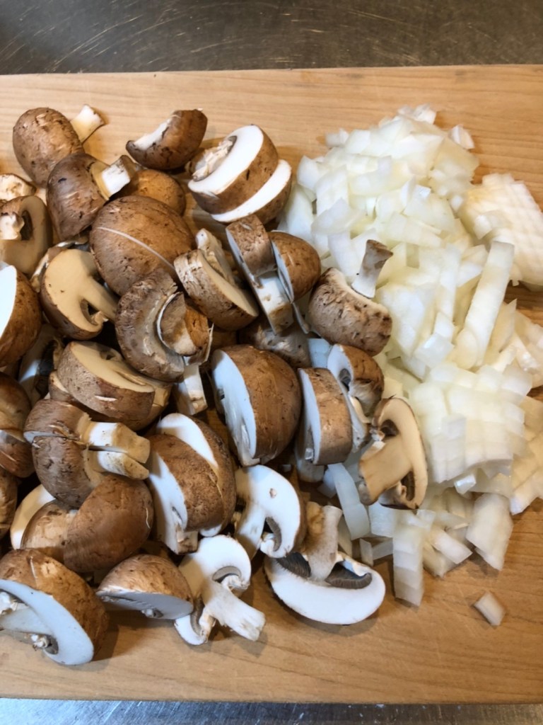 ① マッシュルームは薄切りにする。玉ねぎはみじん切りにする。にんにくもみじん切りにする。
