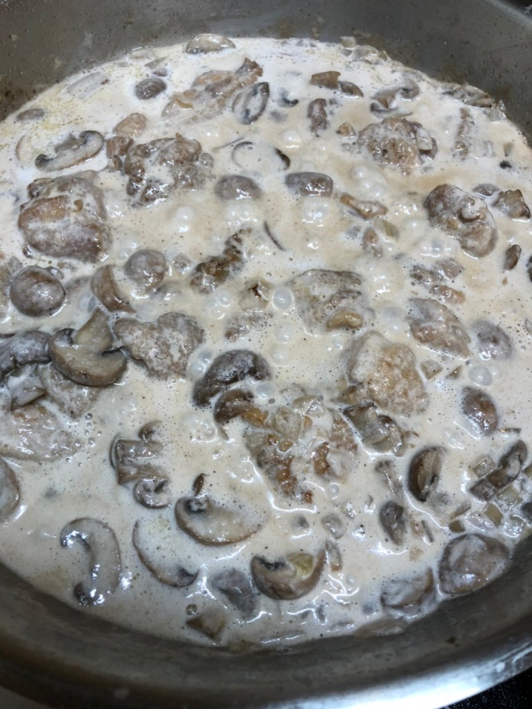 ⑧ マッシュルームの鍋に鶏肉を戻し、さらに5分ほど煮る。