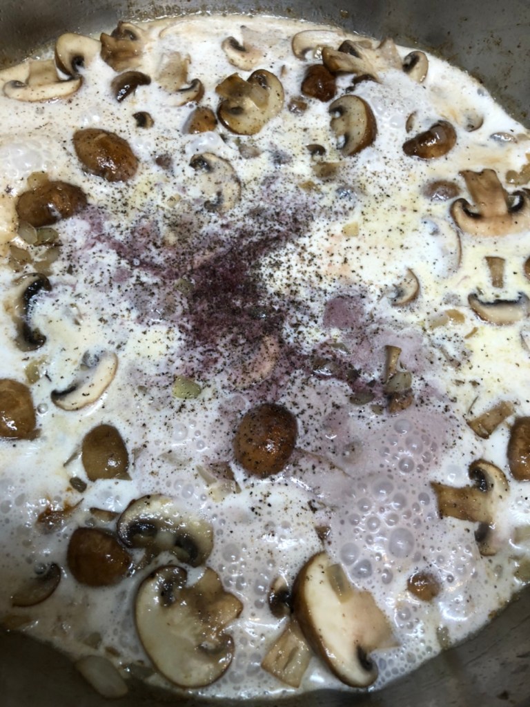 ⑥ マッシュルームがしんなりしてきたら生クリーム、牛乳、赤ワイン、塩、黒胡椒を入れ、5分ほど煮る。